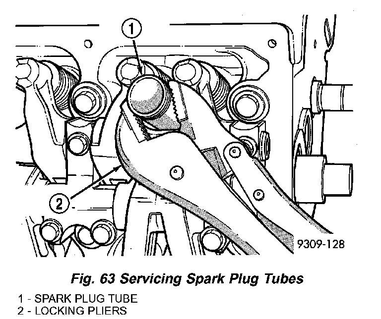 2) Using suitable locking pliers, remove the tube from the cylinder head (Fig. 63) and discard tube.