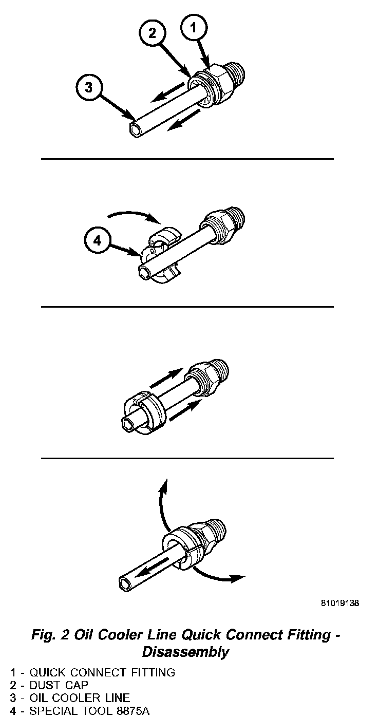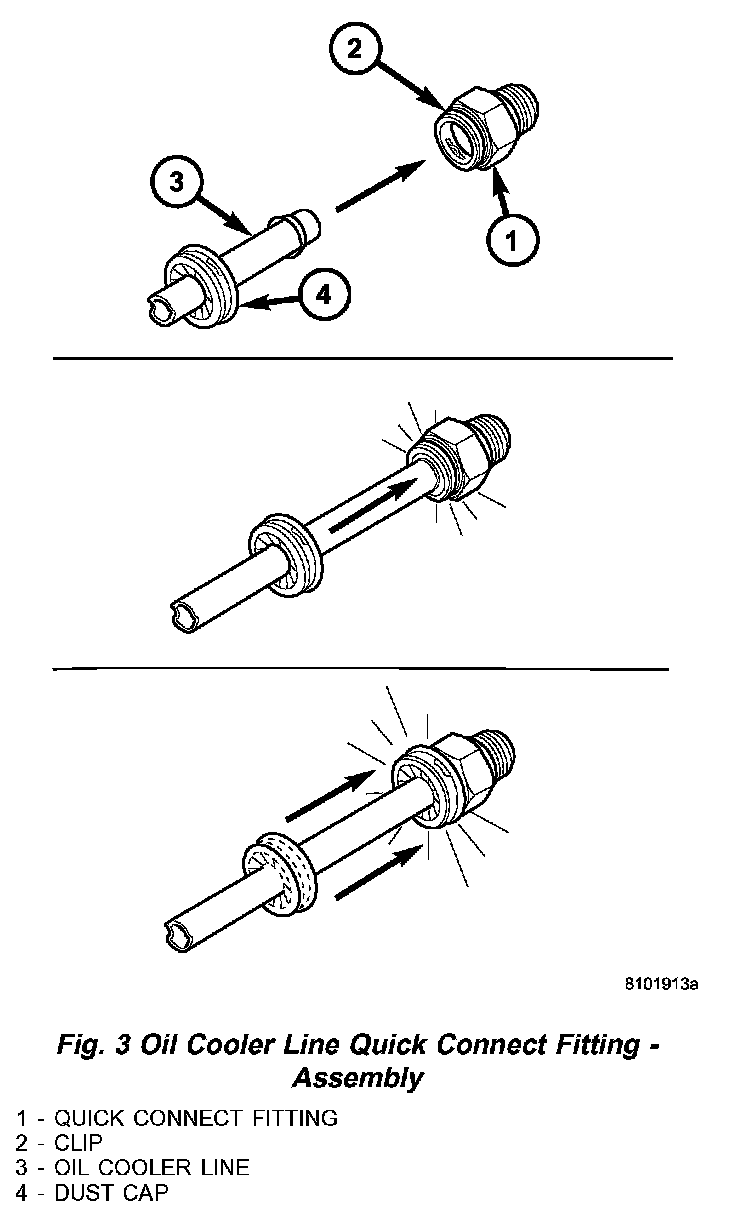 3) Slide dust cap down the transmission cooler line and snap it over the quick connect fitting until it is fully seated and rotates freely (Fig. 3). Dust cap will only snap over quick connect fitting when the transmission cooler line is properly installed.