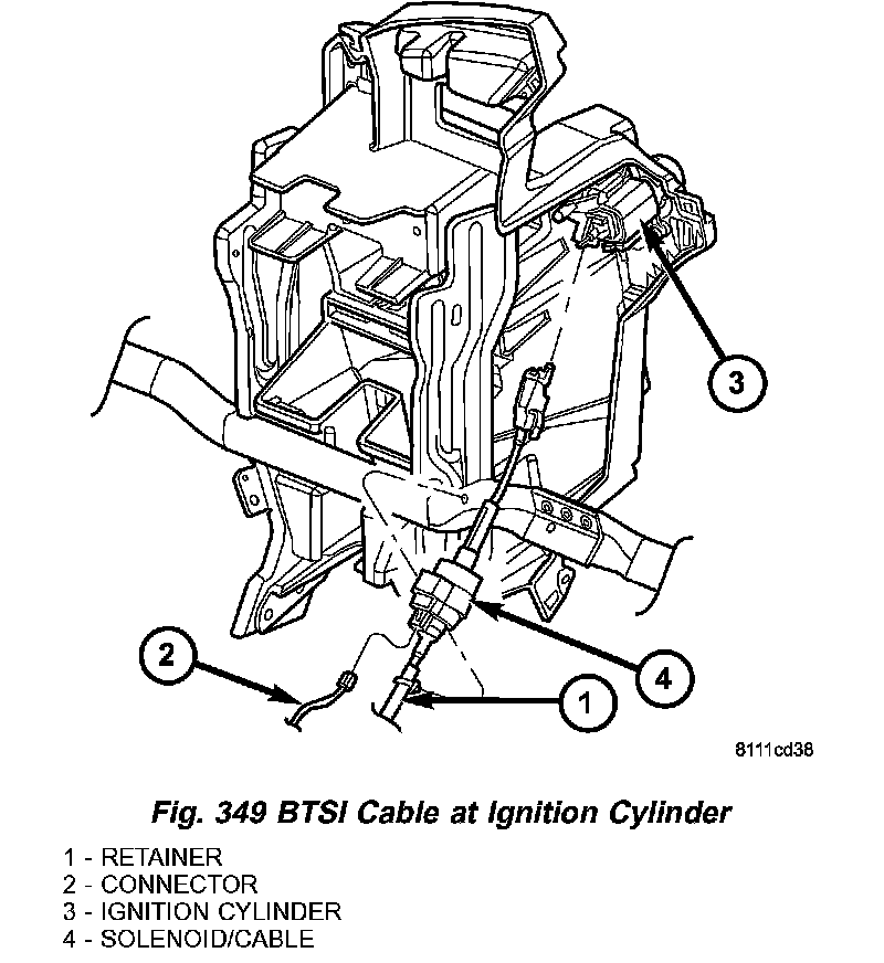 2. Install shift interlock cable to ignition cylinder (Fig. 349). Secure cable to instrument panel at retainer.