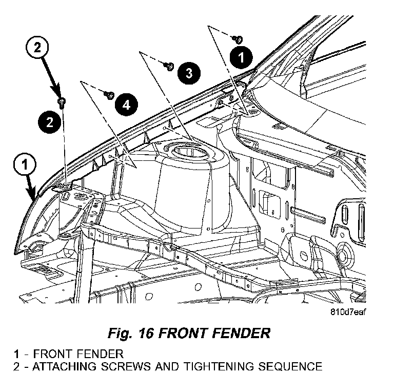 8. With all screws started check fender for proper alignment. Refer to Body and Frame/Specifications/Dimensions.