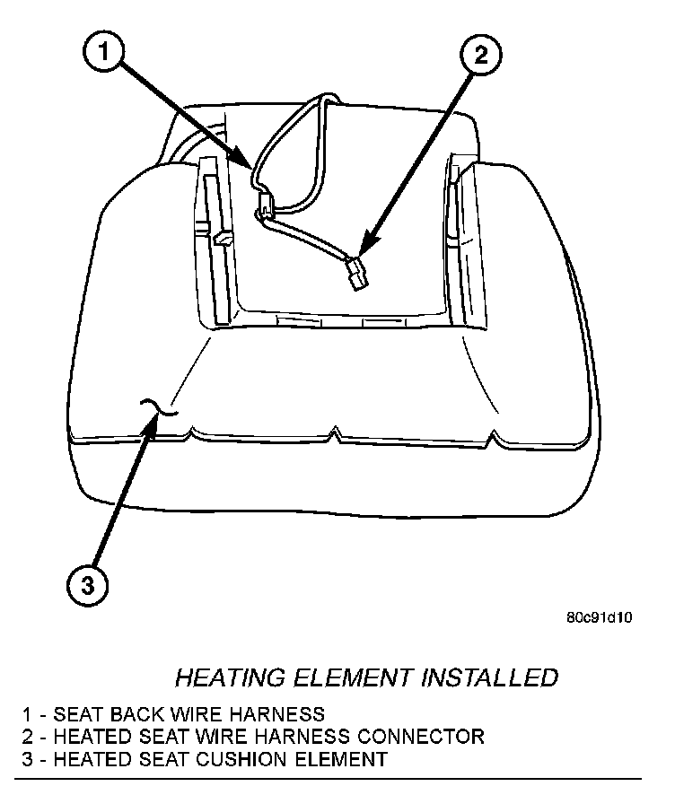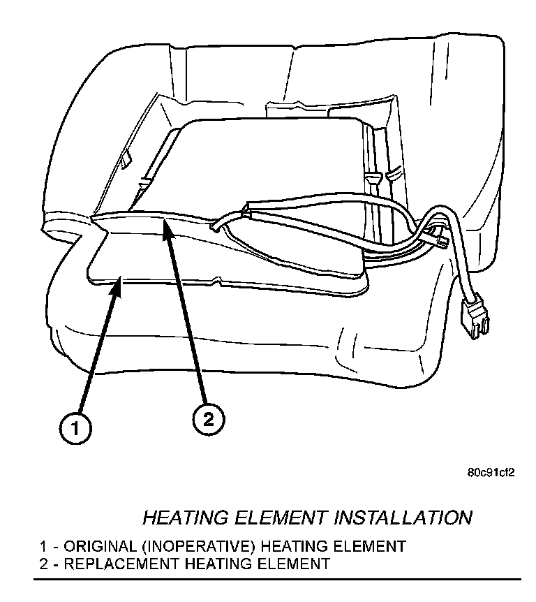 REMOVALNOTE: Do not remove the factory installed heating elements from the seat or seat back cushions. The original element is permanently attached and cannot be removed without permanent damage. The replacement heating element is designed to be applied directly on top of the factory installed heating element.