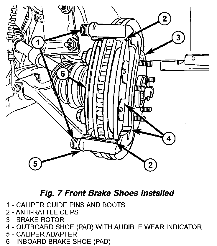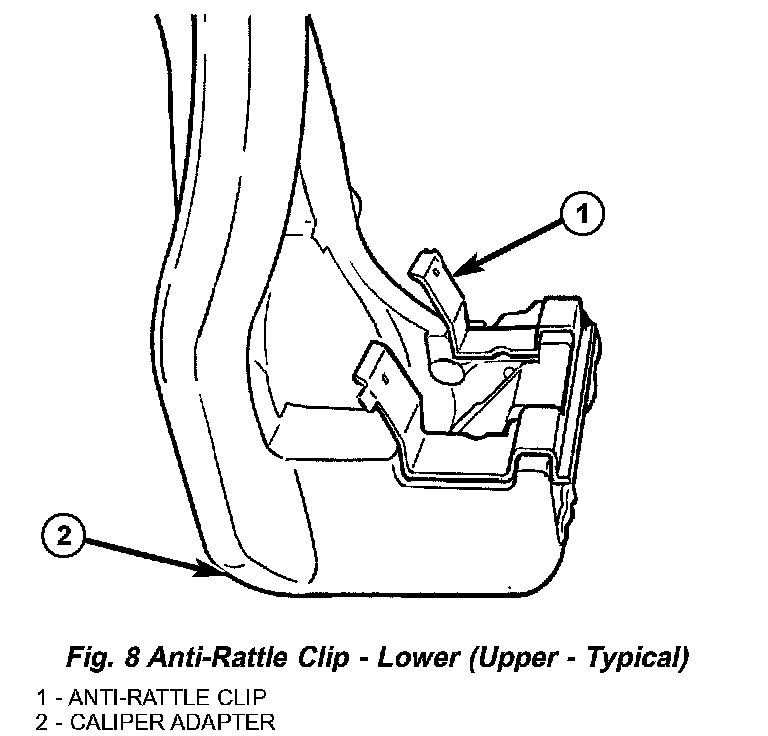 1) Place brake shoes in anti-rattle clips on adapter (Fig. 7). Make sure clips are properly installed (Fig. 8).