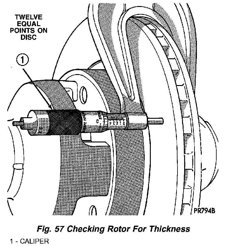 Rotor thickness variation measurements should be made in conjunction with measuring runout. Measure thickness of the brake rotor at 12 equal points around the rotor braking surface with a micrometer at a radius approximately 25 mm (1 inch) from edge of rotor (Fig. 57). If thickness measurements vary beyond the specification listed in the specifications, the rotor should be refaced or replaced.