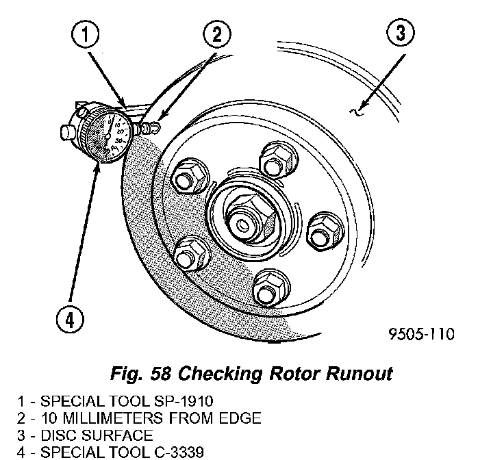 On-vehicle rotor runout is the combination of the individual runout of the hub face and the runout of the rotor. (The hub and rotor runouts are separable). To measure rotor runout on the vehicle, first remove the tire and wheel assembly. Reinstall the wheel mounting nuts on the studs, tightening the rotor to the hub. Mount the Dial Indicator, Special Tool C-3339, with Mounting Adapter, Special Tool SP1910 on steering arm. The dial indicator plunger should contact braking surface of rotor approximately ten millimeters from edge of rotor (Fig. 58). Check lateral runout on both sides of the rotor, marking the low and high spots on both. Runout limits can be found in the specifications.