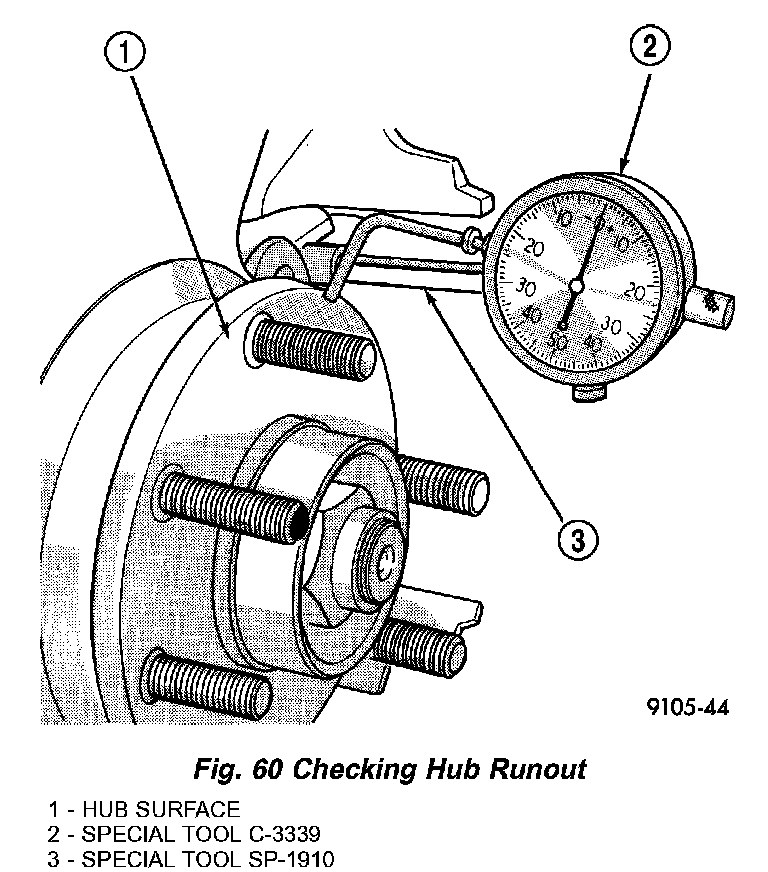 Mount Dial Indicator, Special Tool C-3339, and Mounting Adapter, Special Tool SP-1910, to the steering knuckle. Position the indicator stem so it contacts the hub face near the outer diameter. Care must be taken to position stem outside of the stud circle, but inside of the chamfer on the hub rim (Fig. 60).