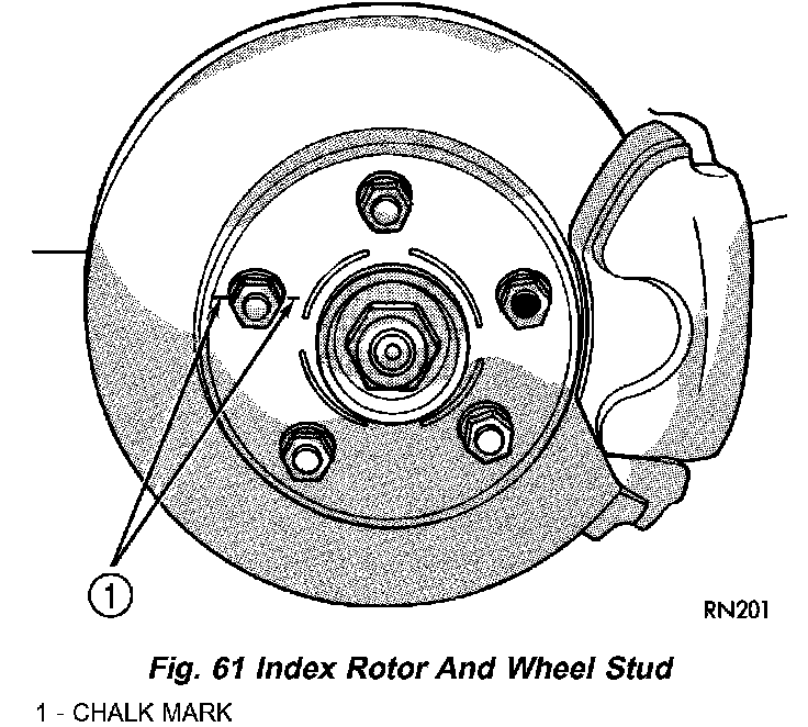 If the hub runout does not exceed this specification, install the rotor back on the hub, aligning the chalk marks on the rotor with a wheel mounting stud, two studs apart from the original stud (Fig. 61). Tighten nuts in the proper sequence and torque to specifications.