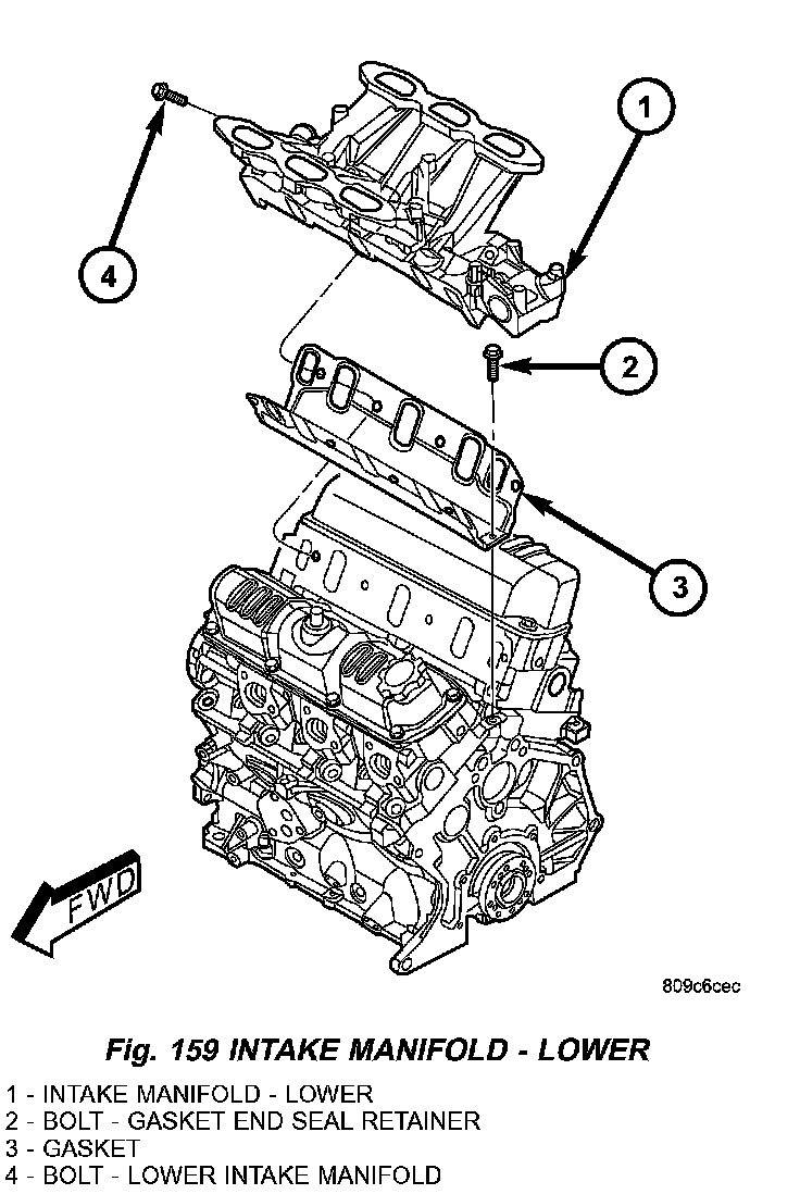 2) Carefully install the new intake manifold gasket (Fig. 159). Tighten end seal retainer screws to 12 Nm (105 inch lbs.).
