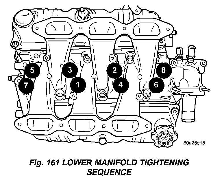 3) Install lower intake manifold (Fig. 159). Install the bolts and torque to 1 Nm (10 inch lbs.). Then torque bolts to 22 Nm (200 inch lbs.) in sequence shown in (Fig. 161). Then torque again to 22 Nm (200 inch lbs.). After intake manifold is in place, inspect to make sure seals are in place.