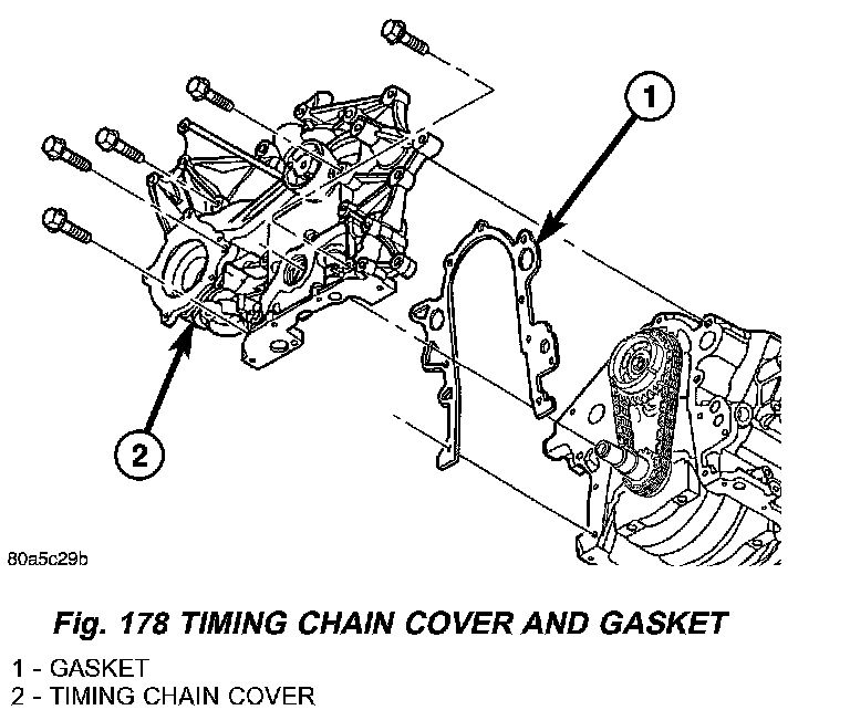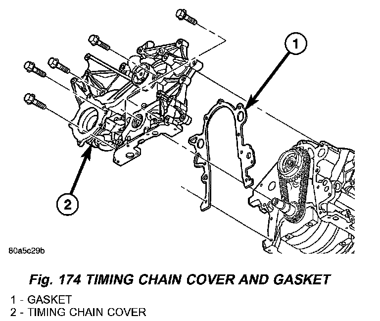 25) Remove the timing chain cover fasteners and remove timing chain cover (Fig. 174).