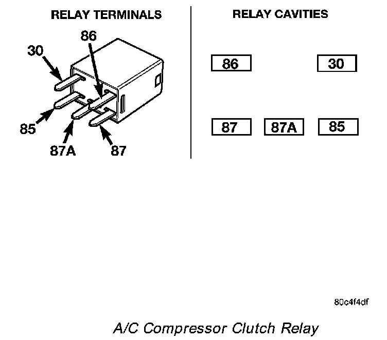 - The normally closed terminal (87A) is not connected to any circuit in this application, but provides a battery current output only when the compressor clutch relay coil is de-energized.