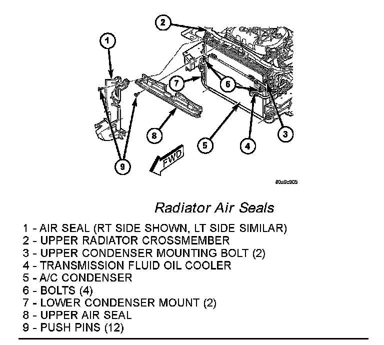 - Be certain that each of the radiator and condenser air seals are reinstalled in their proper locations. These air seals are required in order for the A/C and engine cooling systems to perform as designed.