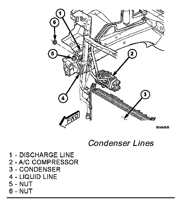 8. Remove the nuts that secure the discharge and liquid lines to the A/C condenser.
