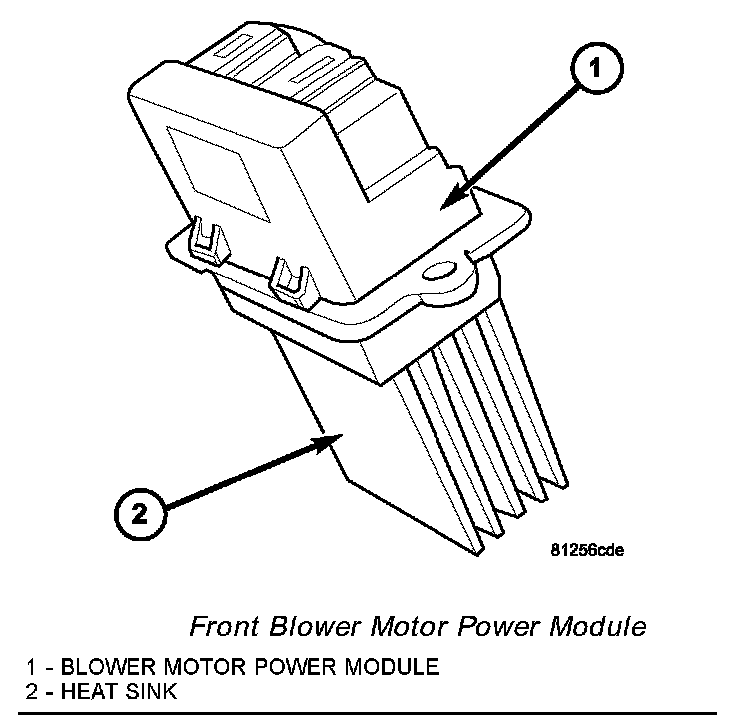 The front blower motor power module is mounted to the rear of the front HVAC housing, directly behind the glove box. The blower motor power module consists of a molded plastic mounting plate with two integral connector receptacles (1). Concealed behind the mounting plate is the power module electronic circuitry and a large finned heat sink (2). The front blower motor power module is accessed for service by removing the glove box.