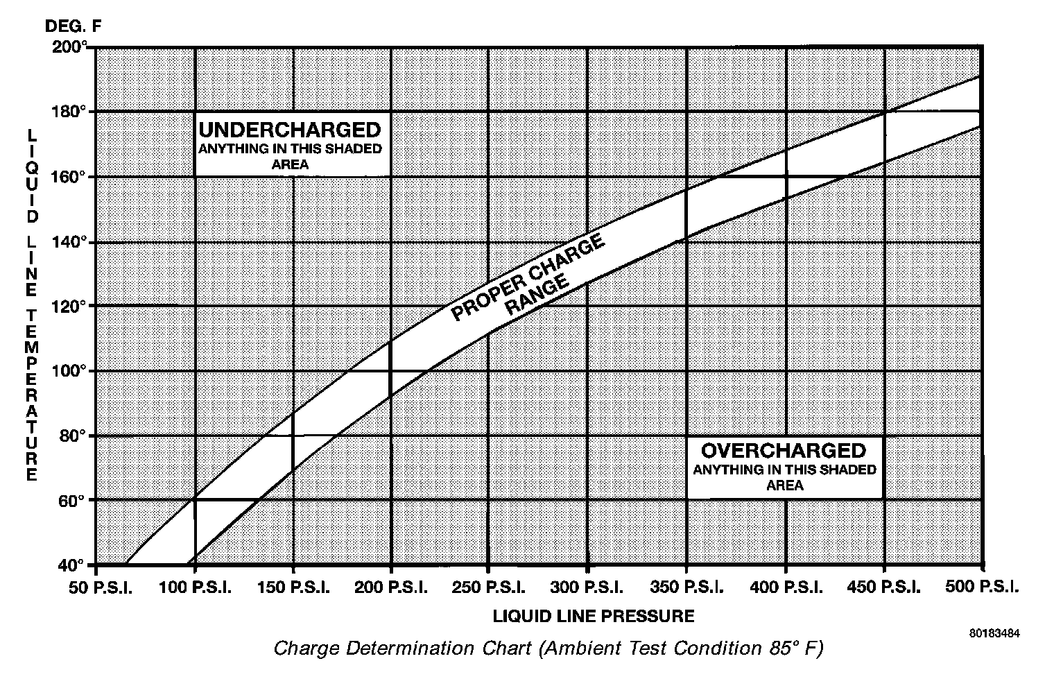 5. Observe the liquid line (discharge) pressure and liquid line temperature. Using the Charge Determination Chart, determine whether the refrigerant system is operating within the proper charge range.