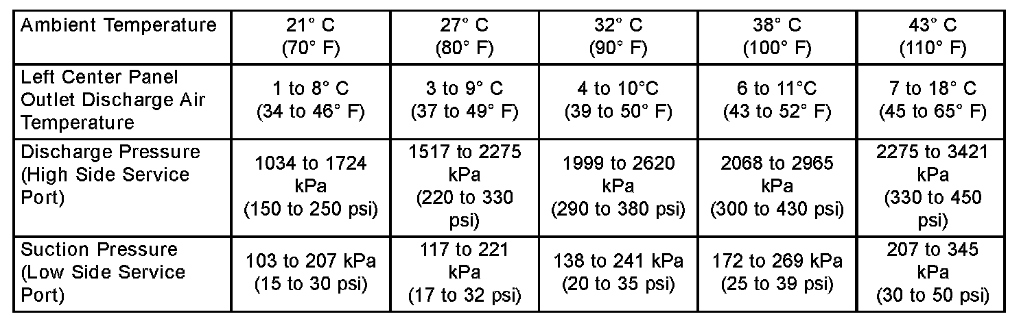 8. Compare the air temperature at the center panel air outlet and the A/C compressor discharge pressure (high side) to the A/C Performance Temperature and Pressure chart.