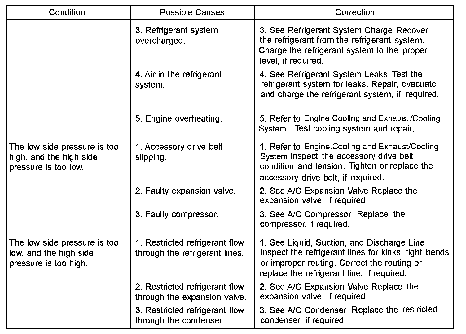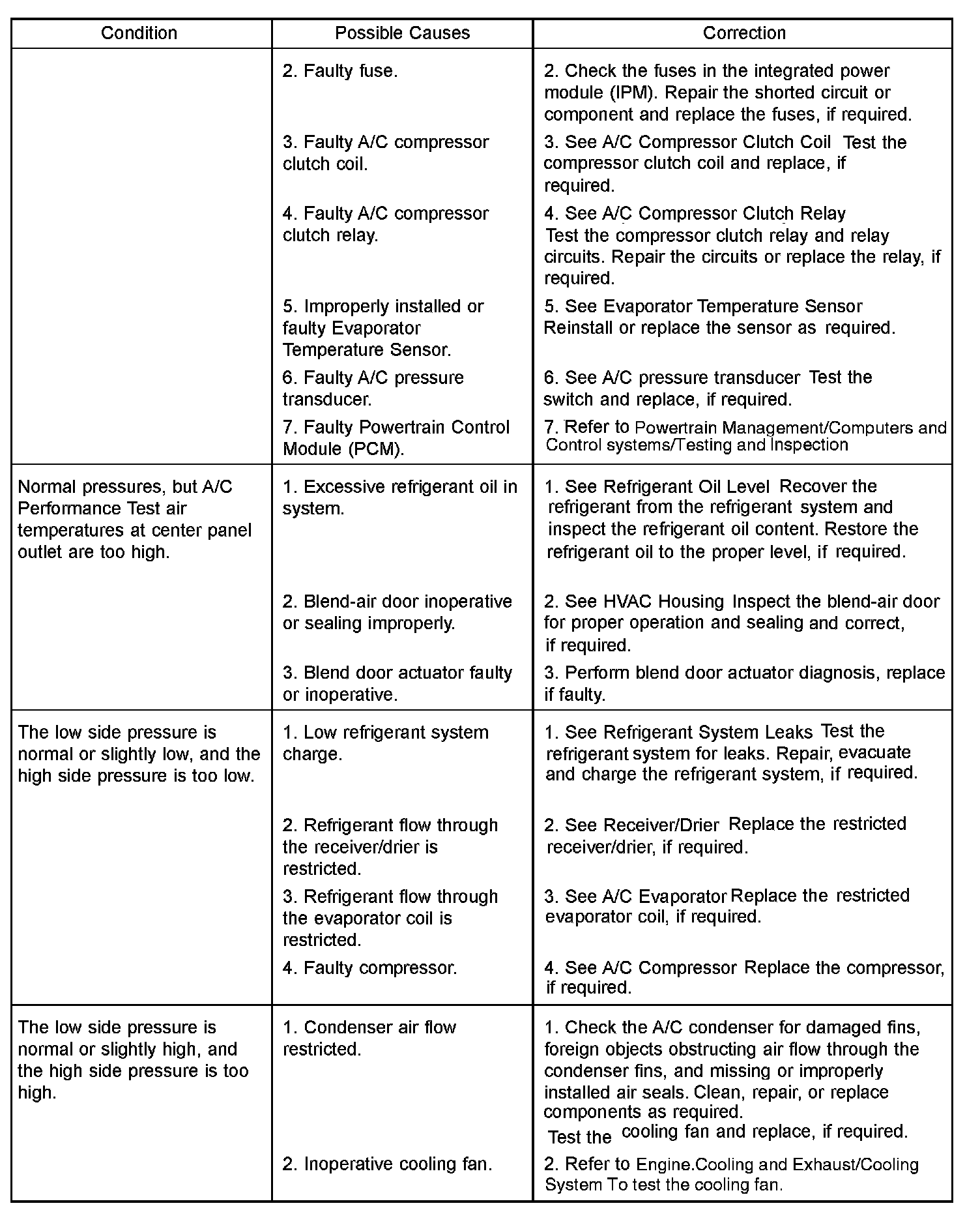 9. If the air outlet temperature fails to meet the specifications in the A/C Performance Temperature and Pressure chart, or if the A/C compressor discharge pressure is high, refer to the A/C Pressure Diagnosis chart.