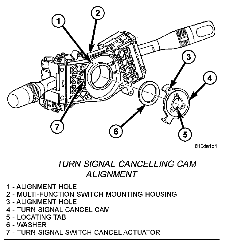 1. Rotate the turn signal cancel cam in the multifunction switch housing until the alignment hole in the one cam lobe is aligned with the alignment hole in the back of the housing. The oblong hole in the hub of the cam should now be at the top, and the locating tab in the hub of the cam should be at the bottom.