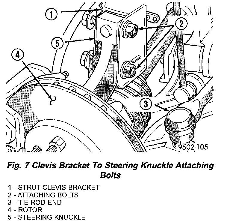 3. Remove the top and bottom strut clevis bracket-to-steering knuckle attaching bolts (Fig. 7) and discard. Separate the steering knuckle from the strut clevis bracket and position steering knuckle so it is out of the way of the strut.