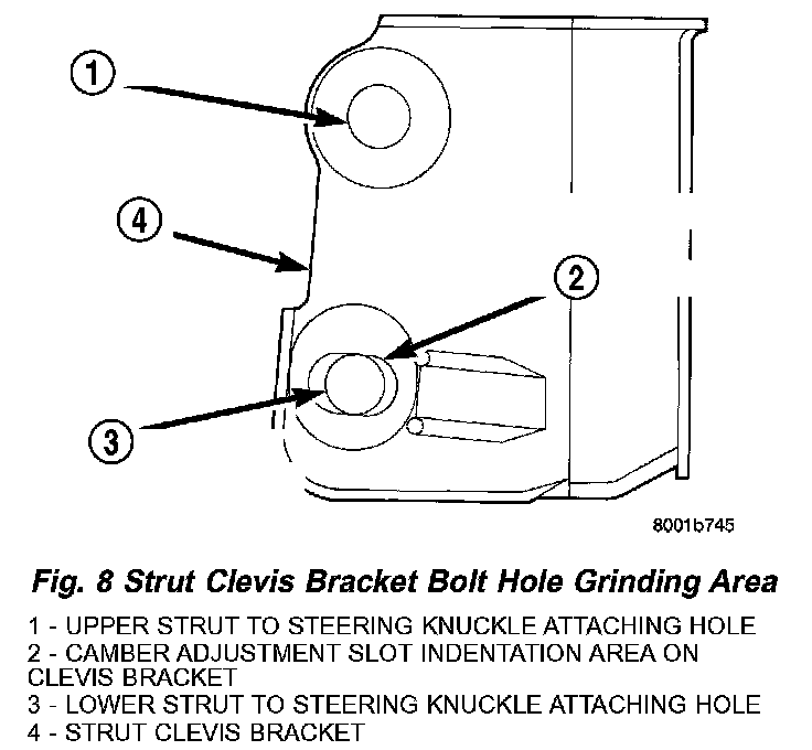 4. Using an appropriate grinder and grinding wheel, slot the bottom hole in both sides of the strut clevis bracket (Fig. 8).
