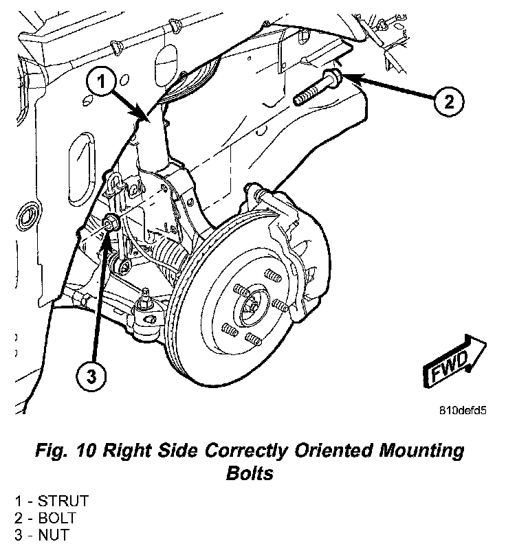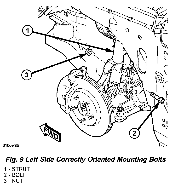 NOTE: The strut clevis-to-knuckle bolts are installed differently on each side of the vehicle. Left-hand-side bolts are installed from vehicle rear to front (Fig. 9). Right-hand-side bolts are installed from vehicle front to rear (Fig. 10).