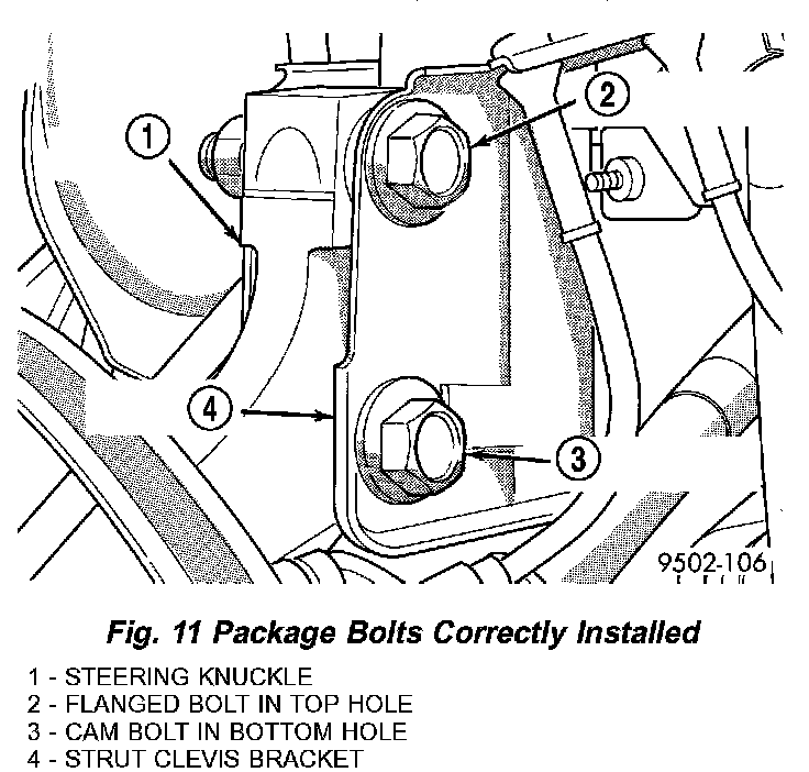 5. Position the knuckle back into the strut clevis bracket. Using the direction indicated in the above note, install a flanged bolt from the service package into the upper mounting hole. Using the direction indicated in the above note, install a cam bolt into the bottom mounting hole (Fig. 11).