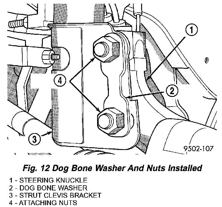 6. Install a dog bone washer on the steering knuckle to strut clevis bracket attaching bolts, then install the nuts onto the bolts from the service package (Fig. 12). Tighten the bolts just enough to hold the steering knuckle in position when adjusting camber, while still allowing the steering knuckle to move in clevis bracket.