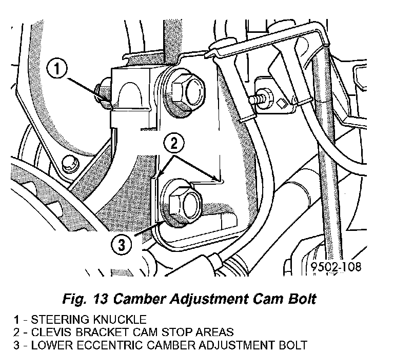 10. Adjust front camber to the preferred setting by rotating the lower eccentric cam bolt against the cam stop areas on the strut clevis bracket (Fig. 13). When camber is set, tighten the upper strut clevis bracket bolt and lower cam bolt. Again jounce front and rear of vehicle an equal amount of times and verify front camber setting. Torque both front strut to steering knuckle attaching bolts to 88 Nm (65 ft. lbs.) plus an additional 1/4 (90°) turn after the required torque is met.