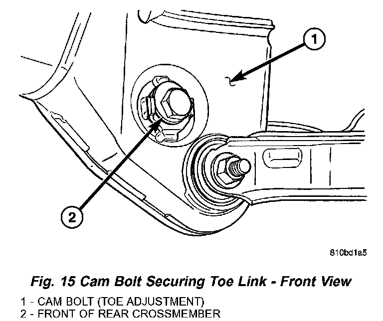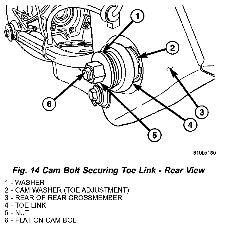 1. Loosen the cam bolt nut securing the toe link to the rear crossmember just enough to rotate the cam bolt (Fig. 14).