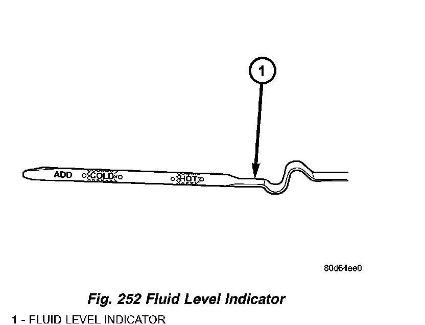 The torque converter fills in both the P Park and N Neutral positions. Place the selector lever in P Park to be sure that the fluid level check is accurate. The engine should be running at idle speed for at least one minute, with the vehicle on level ground. At normal operating temperature 82°C (180°F), the fluid level is correct if it is in the HOT region on the oil level indicator (Fig. 252). The fluid level should be within the COLD region of the dipstick at 27°C (80°F) fluid temperature.