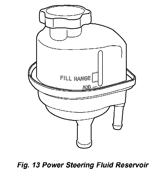 The fluid level can be read on the exterior of the power steering fluid reservoir. The fluid level should be within the "FILL RANGE" when the fluid is at normal ambient temperature, approximately 21°C to 27°C (70°F to 80°F) (Fig. 13).