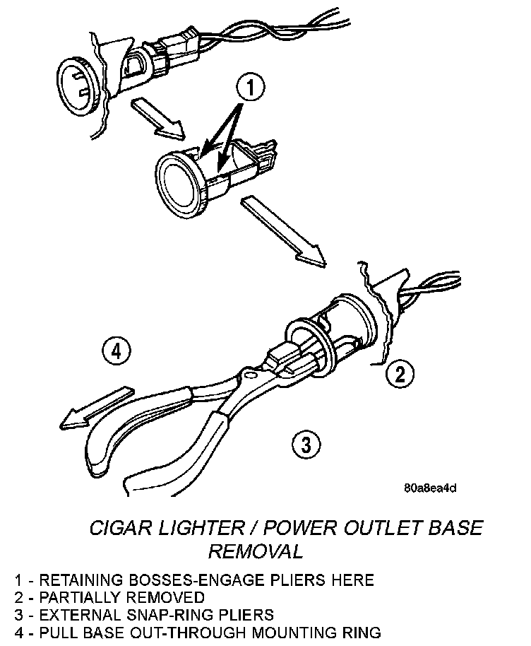 3. Using external snap ring pliers with 90 degree tips. Insert pliers with tips against bosses and squeeze forcing bosses out of base.