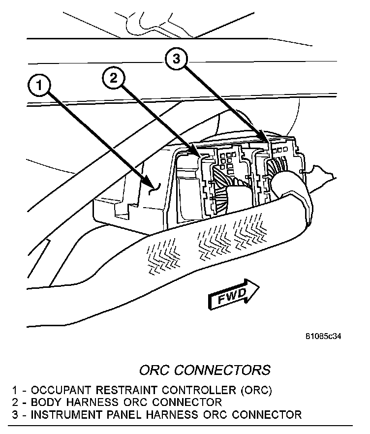 WARNING: ON VEHICLES EQUIPPED WITH THE OCCUPANT CLASSIFICATION SYSTEM (OCS), NEVER REPLACE BOTH THE OCCUPANT RESTRAINT CONTROLLER (ORC) AND THE OCCUPANT CLASSIFICATION MODULE (OCM) AT THE SAME TIME. IF BOTH REQUIRE REPLACEMENT, REPLACE THE OCM FIRST. THEN PERFORM THE AIRBAG SYSTEM TEST INCLUDING AN IGNITION-ON TIME OF AT LEAST ONE MINUTE BEFORE REPLACING THE ORC. BOTH THE ORC AND THE OCM STORE OCS CALIBRATION DATA, WHICH THEY TRANSFER TO ONE ANOTHER DURING THE FIRST MINUTE OF IGNITION-ON TIME AFTER ONE OF THEM IS REPLACED. IF BOTH MODULES ARE REPLACED AT THE SAME TIME, AN IRREVERSIBLE FAULT WILL BE SET IN BOTH MODULES.REMOVAL