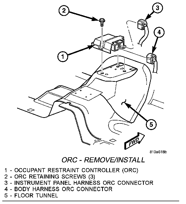 5. Remove the three retaining screws to the ORC. One on the left side of the floor tunnel, and one in front of (toward bulkhead) and behind (toward vehicle rear) the ORC unit.