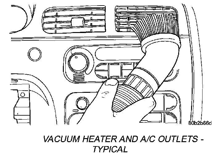 Use a vacuum cleaner to remove any residual powder from the vehicle interior. Work from the outside in to avoid kneeling or sitting in a contaminated area. Vacuum the heater and A/C outlets as well. If the heater or air conditioner was in RECIRC mode at time of airbag deployment, operate blower motor on low speed and vacuum powder residue expelled from the heater and A/C outlets. Multiple vacuum cleaning may be necessary to decontaminate the interior of the vehicle.