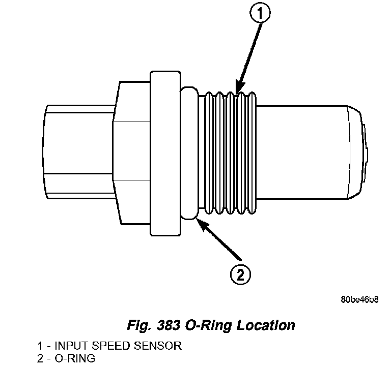 The Input Speed Sensor is a two-wire magnetic pickup device that generates AC signals as rotation occurs. It is threaded into the transaxle case (Fig. 382), sealed with an O-ring (Fig. 383), and is considered a primary input to the Powertrain/Transmission Control Module.