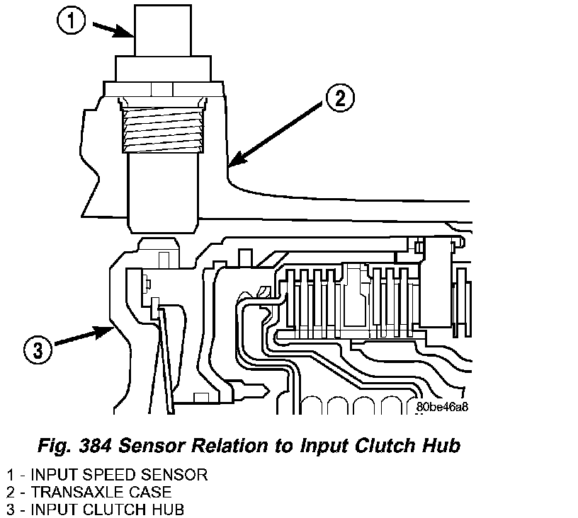 The Input Speed Sensor provides information on how fast the input shaft is rotating. As the teeth of the input clutch hub pass by the sensor coil (Fig. 384), an AC voltage is generated and sent to the PCM/TCM. The PCM/TCM interprets this information as input shaft rpm.
