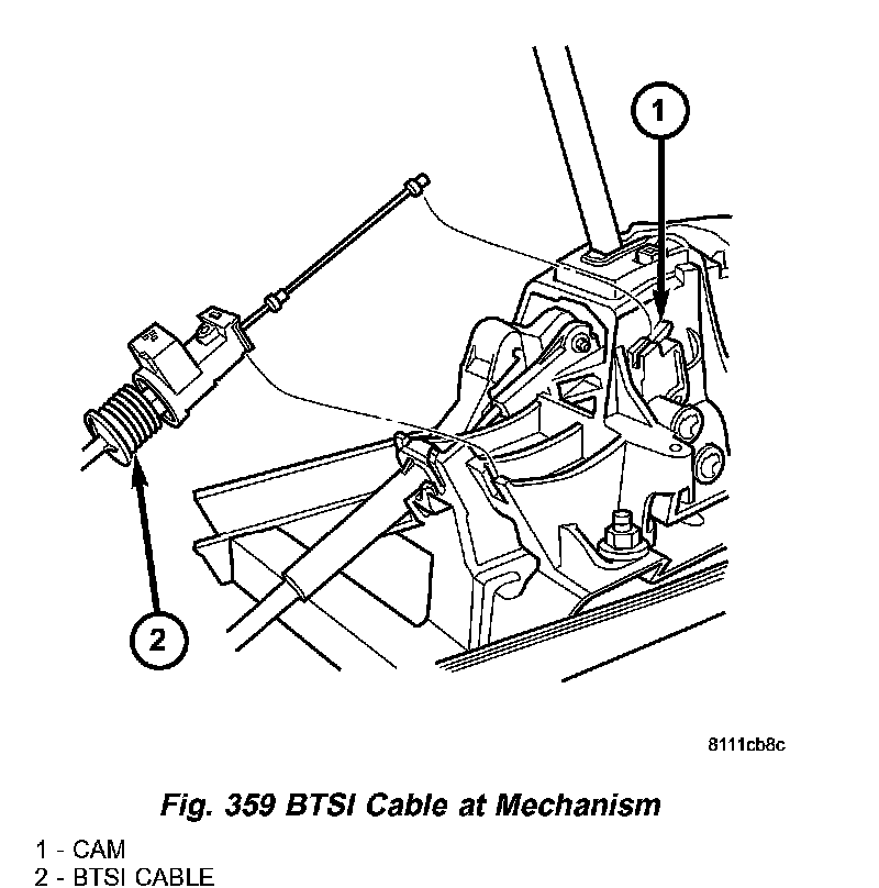 6. If the interlock cable is not being replaced, the pin will not exist. Loosen the locking clip (Fig. 359) on the interlock cable to allow cable to "self adjust." Press locking clip (Fig. 359) by hand to secure adjustment.