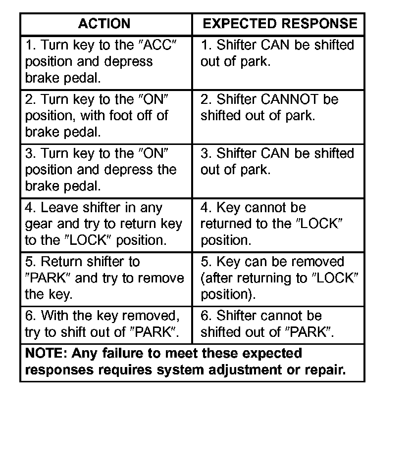 SHIFT INTERLOCK SYSTEMThe following chart describes the normal operation of the Brake Transmission Shift Interlock (BTSI) system. If the "expected response" differs from the vehicle's response, then system repair and/or adjustment is necessary.