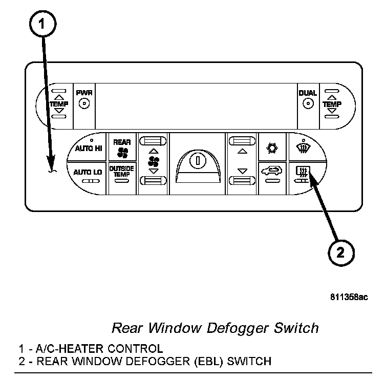 The switch for the rear window defogger (EBL) system is integrated into the A/C-heater control, which is located in the center of the instrument panel. When the rear window defogger switch is activated, the A/C-heater control requests the integrated power module (IPM) to operate the rear window defogger (EBL) relay.