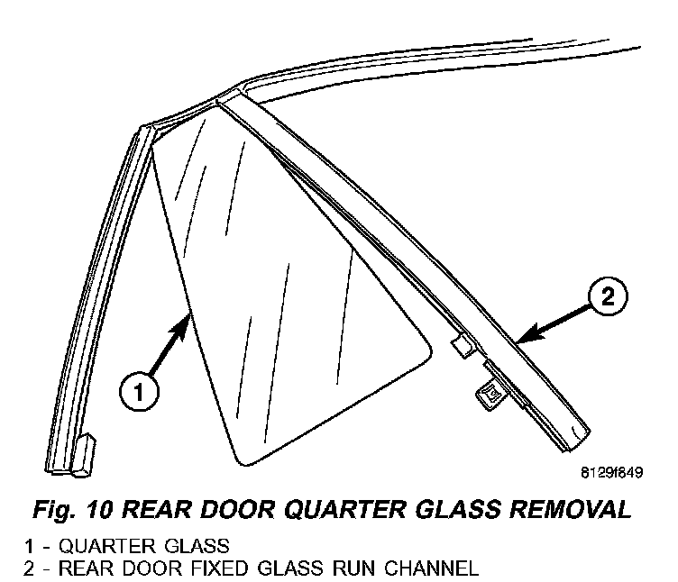 10. Remove quarter glass from fixed glass run channel (Fig. 10) and (Fig. 11).