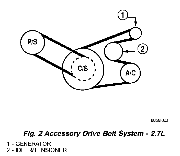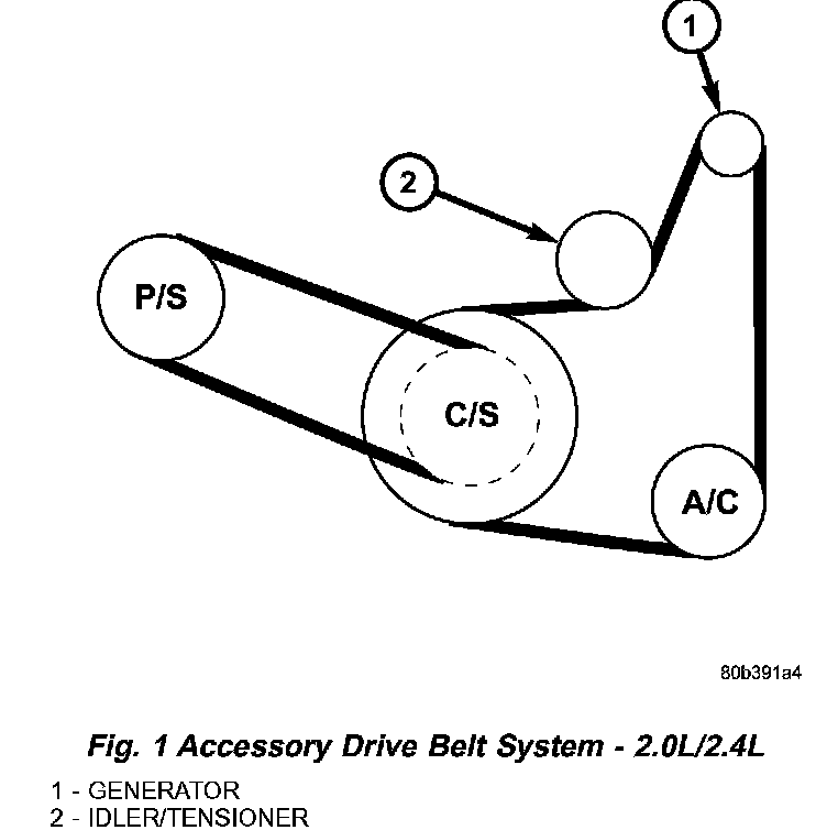 The accessory drive consists of two Poly-V type belts (Fig. 1) or (Fig. 2). One belt drives the power steering pump, the other drives the generator and air conditioning compressor. Both belts on the 2.7L engine are manually tensioned. The power steering belt on the 2.0L/2.4L engine is manually tensioned. The air conditioning/generator belt on the 2.0L/2.4L engine has an automatic belt tensioner.