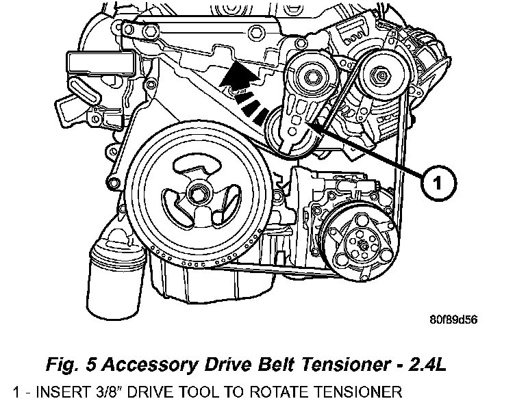 4. Gently apply a force to rotate belt tensioner clockwise until the belt tensioner bottoms out and the belt can be removed from pulleys (Fig. 4) or (Fig. 5).