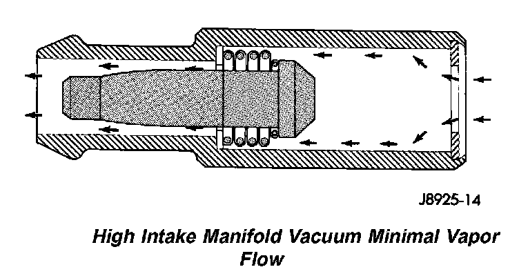 When the engine is at idle or cruising, high manifold vacuum is present. At these times manifold vacuum is able to completely compress the spring and pull the plunger to the top of the valve. In this position there is minimal vapor flow through the valve.