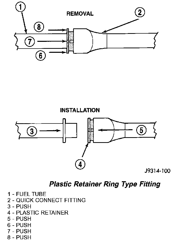 4. To release fuel system component from quick-connect fitting, firmly push fitting towards component being serviced while firmly pushing plastic retainer ring into fitting. With plastic ring depressed, pull fitting from component. The plastic retainer ring must be pressed squarely into fitting body. If this retainer is cocked during removal, it may be difficult to disconnect fitting. Use an open-end wrench on shoulder of plastic retainer ring to aid in disconnection.