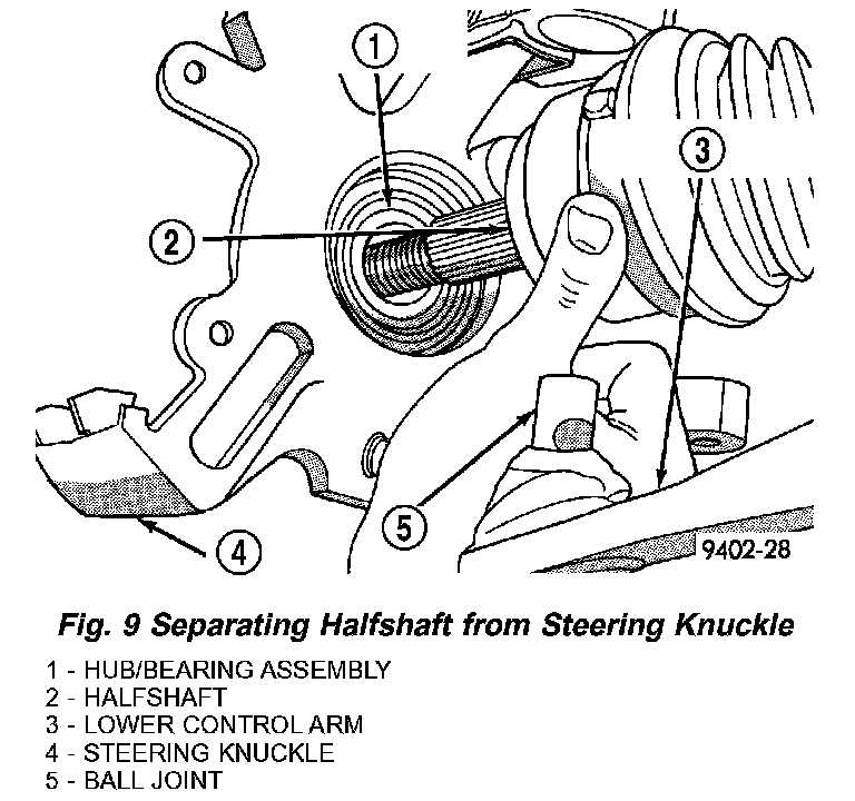 11. Separate halfshaft from steering knuckle (Fig. 9). If difficulty is encountered separating halfshaft from knuckle, DO NOT strike halfshaft with a hammer to break free. Install Puller 1026 (Fig. 10) as shown in to press shaft out of hub/bearing assembly.