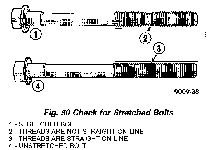 NOTE: The connecting rod bearing cap bolts must be examined before reuse. If the threads are necked down due to stretching, the bolt(s) must be replaced (Fig. 50).