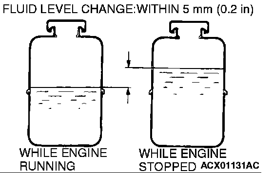 3. Check the fluid in the oil reservoir for foaming or milkiness. Check the difference of the fluid level when the engine is stopped, and while it is running. If the change of the fluid level is 5 mm (0.2 inch) or more, air bleeding should be done.