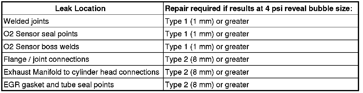 Any Type 1 or greater leaks found in welded joints, O2 sensor seal points or O2 sensor boss welds must be repaired or the component must be replaced.