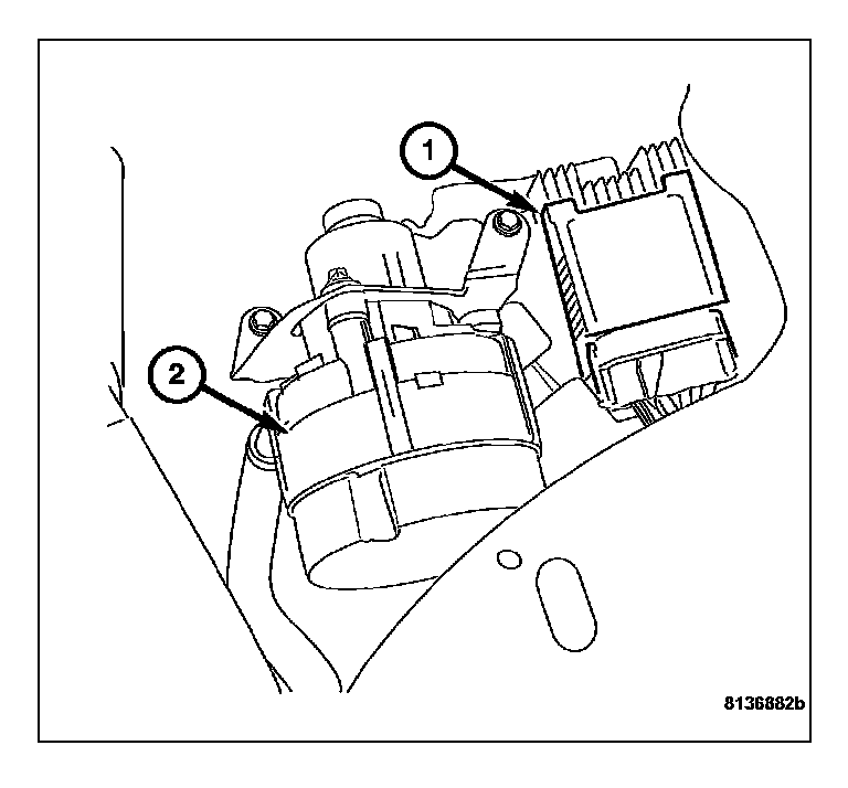 1. Position the radiator fan control module (1) on the inner fender well studs next to the air pump (2).