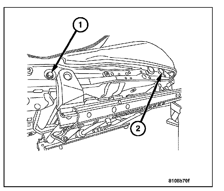 4. Tilt the rear track mechanism outward then remove the power seat track front inboard and outboard attachment bolts (2).